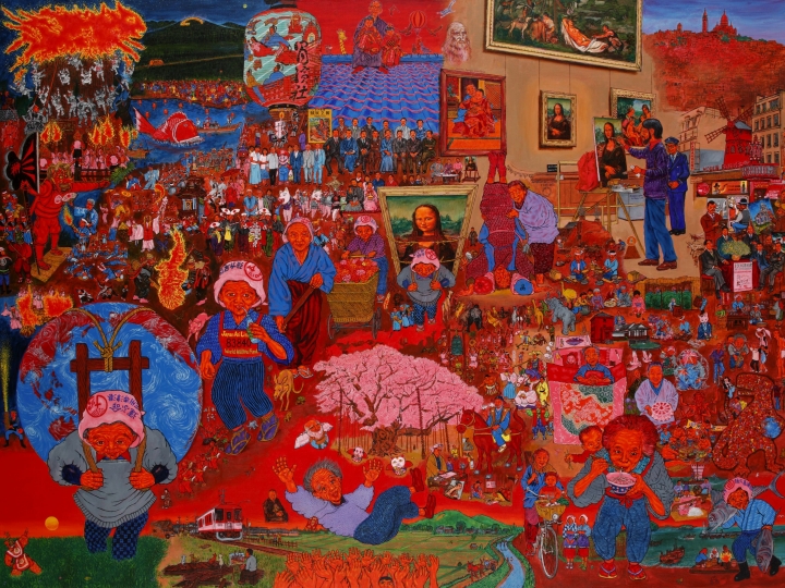 ルーヴル美術館でモナ・リザを模写しながらモナ・リザはレオナルドの母の像、背景は故郷ヴィンチ村の風景を悟り、自分もパリではなく故郷の母や風物を描くべきと考えた。帰国後、独立展を中心に最も身近な人々や祭り、風俗を描いてきた。おかげで色々な賞を頂き、海外でも展覧会を開くことができるようになった。画集記念にモナ・リザ模写から描いてきた画業の集大成的な画面を創り上げた。第八十回記念独立展出展。