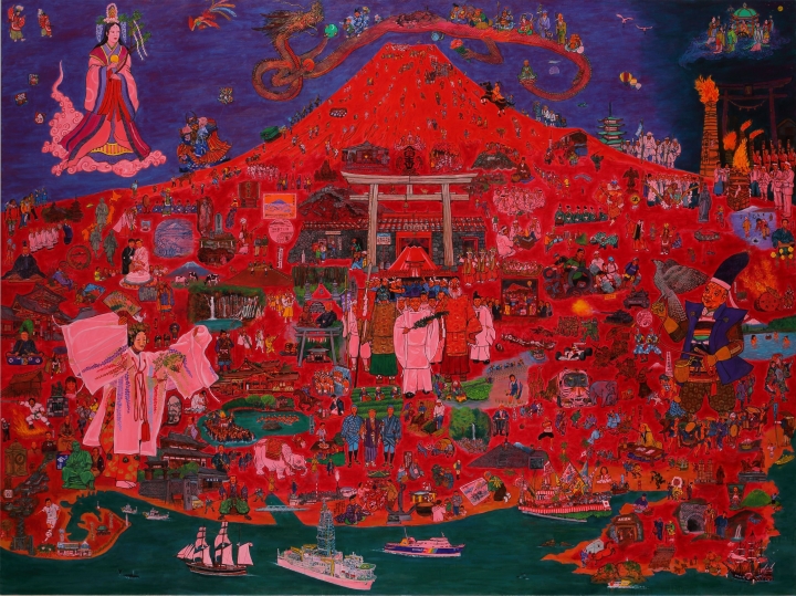 第52回独立展(1984年)で「らくがき富士」の作品で会員に推挙された。看板に埋もれたらくがきだらけの富士山は失礼だったという思いがあったので、世界遺産認定を寿ぎ、木花咲耶姫や羽衣伝説から地球探査船まで、富士山周辺の大きな歴史を一枚の画面に収めた。